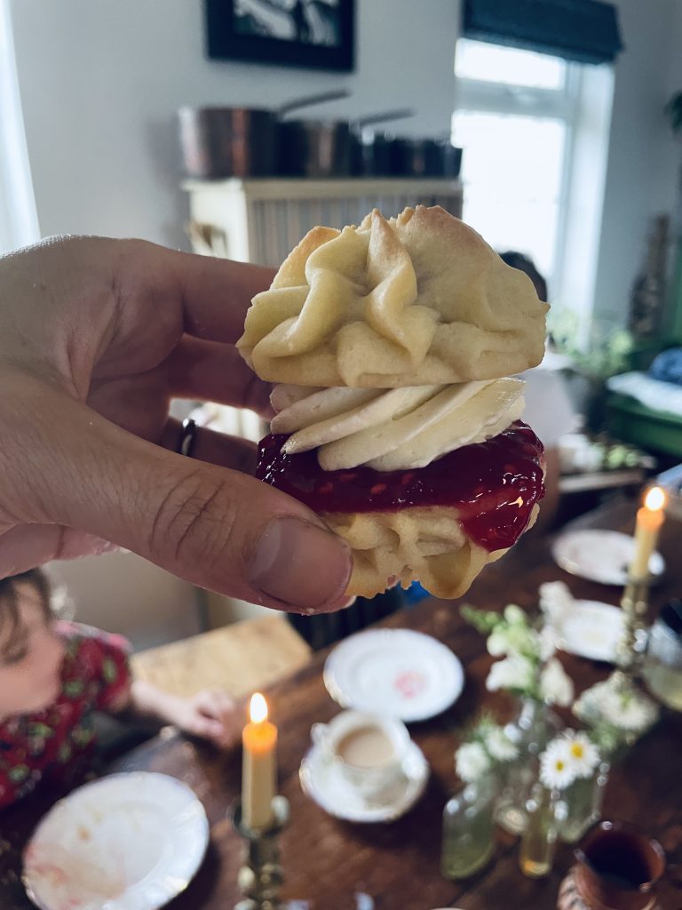To assemble, spread a little jam on the biscuits, pipe a swirl of cream and sandwich pairs together.
